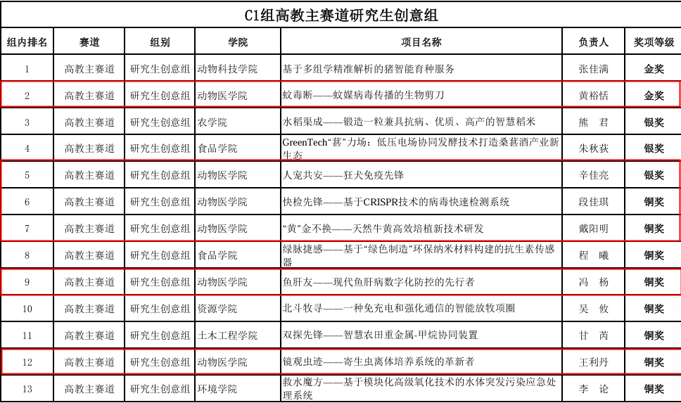 由教育部、中央统战部、中央网信办、国家发展改革委等部门联合主办,中国国际大学生创新大赛(2025)校级决赛中,我院团队表现卓越,高教主赛道研究生创业组:《蚊毒断——蚊媒病毒传播的生物剪刀》斩获金奖,项目针对蚊媒病毒传播难题,提出生物防控新策略;《宠共安——狂犬免疫先锋》获银奖,聚焦宠物狂犬病防控技术创新;《快检先锋——基于CRISPR技术的病毒快速检测系统》等4个项目获铜奖。高教主赛道本科创意组:《鸭疫无忧》项目获银奖,延续了其在省级赛事中的优异表现。