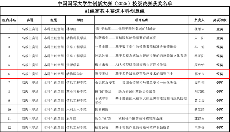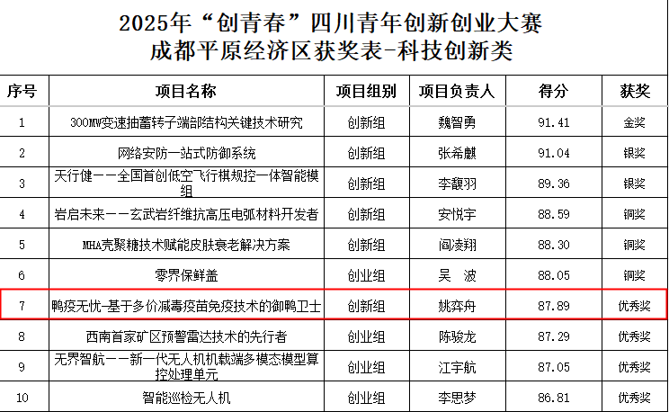 由共青团四川省委等11部门联合主办,2025年“创青春”四川青年创新创业大赛成都平原经济区决赛中,我院项目《鸭疫无忧——基于多价减毒活疫苗免疫技术的“御”鸭卫士》获科技创新类优秀奖。