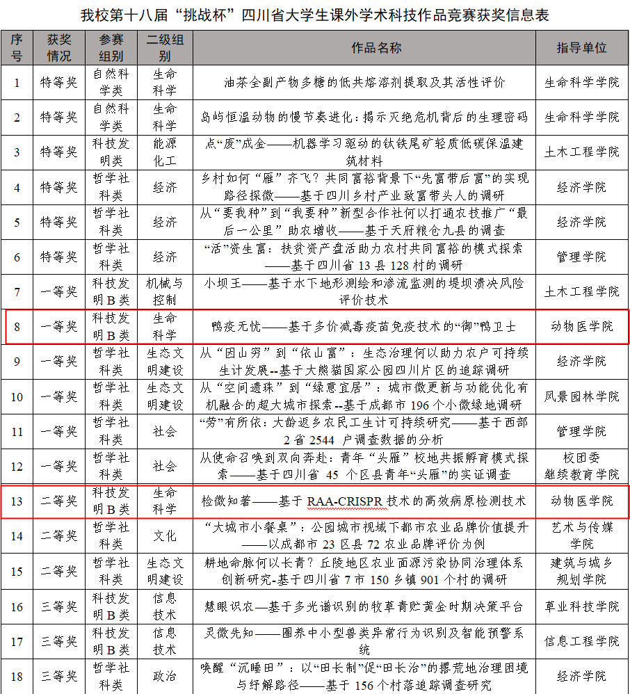 由共青团四川省委联合省委组织部、教育厅、科技厅、人力资源社会保障厅、省科协、省社科院、省学联等单位共同主办,第十八届“挑战杯”四川省大学生课外学术科技作品竞赛中,我院两项作品脱颖而出:《鸭疫无忧——基于多价减毒活疫苗免疫技术的“御”鸭卫士》荣获一等奖,《检微知著——基于RAA-CRISPR技术的高效病原检测方法》获得二等奖。